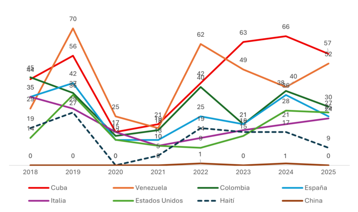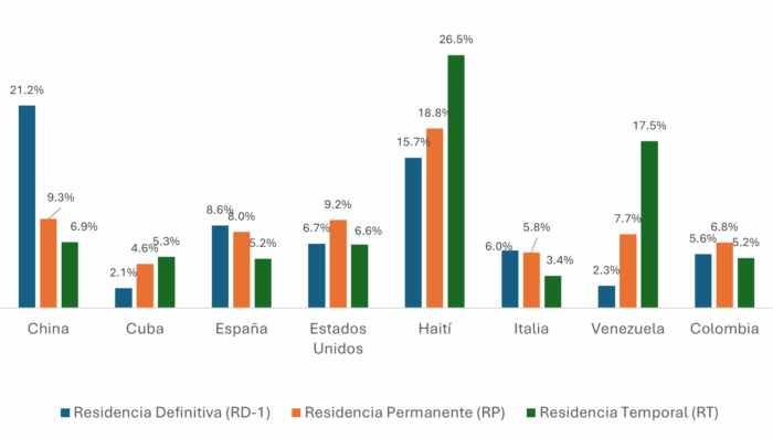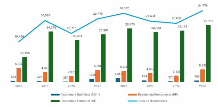 Durante el periodo 2018-2025, en promedio anual, el 79.2 % de las residencias emitidas han sido temporales, el 17.9 % residencias permanentes y el 2.9 % han sido residencias definitivas. Esto refleja un proceso de integración migratoria gradual en donde la inmensa mayoría primero ingresa con un estatus migratorio temporal y luego algunos se van moviendo hacia la permanencia.